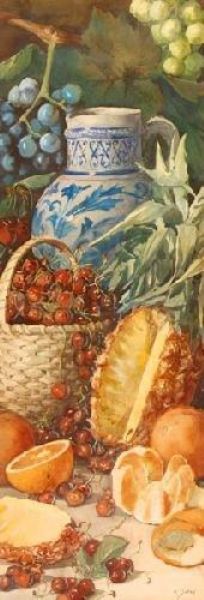 | Still life of pineapple, cherries, lemons and grapes, with a blue and white chinese jug | |