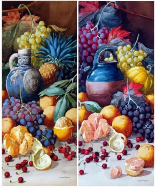 Still Life Studies of Mixed Fruit and Stoneware Ewers