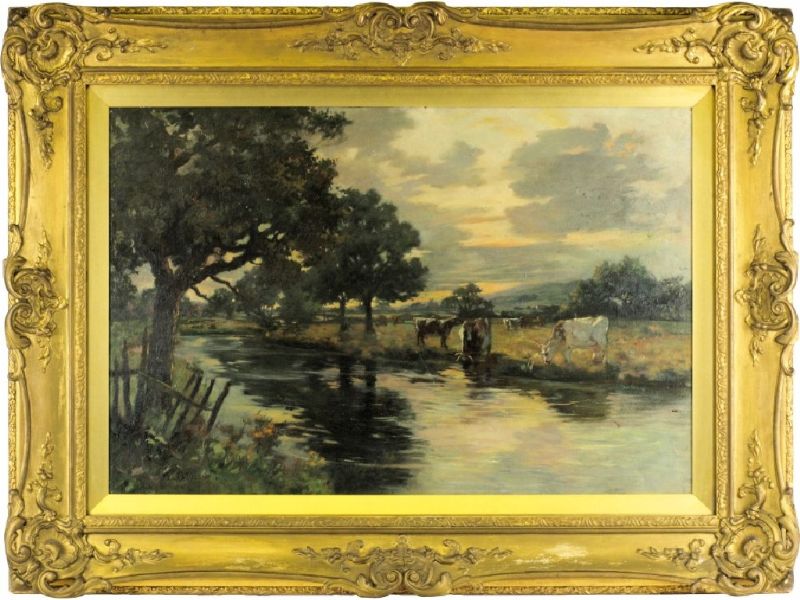 Sunset; cattle watering by a lowland river