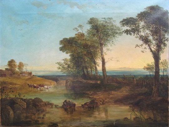 | Cattle watering at a pond beneath trees, a farmstead in the distance, at sunset | |