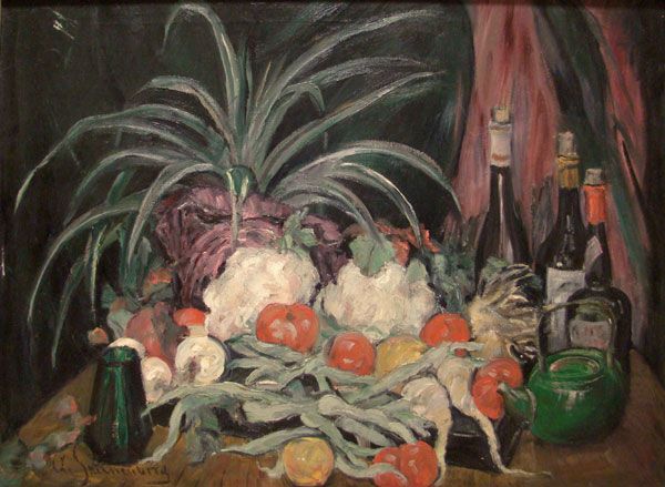 Üppiges Stillleben mit Gemüse, Flaschen und Tafelgerät