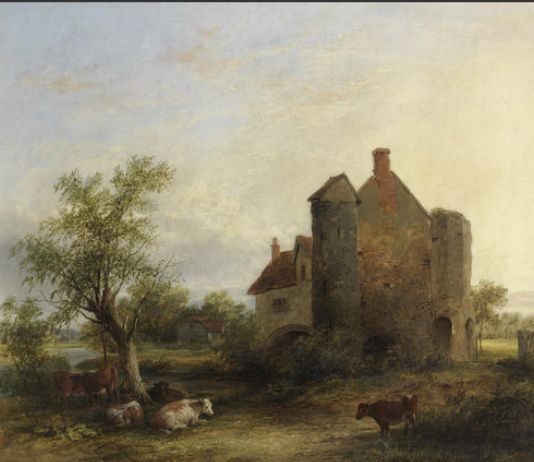 Cattle resting by a manor house
