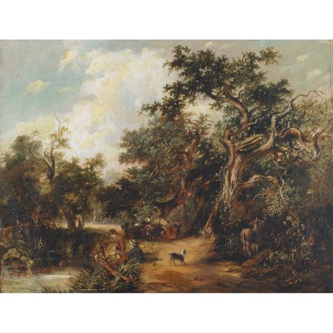 GYPSIES FISHING FROM A STREAM WITH HORSE AND WAGON