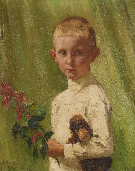 PORTRAIT OF A BOY WITH A FLOWERING BRANCH AND A MONKEY