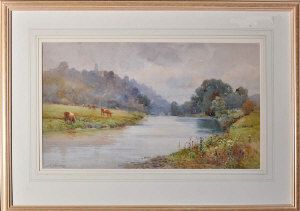 CATTLE GRAZING ALONG THE BANK OF A RIVER WITH A TOWN IN THE DISTANCE