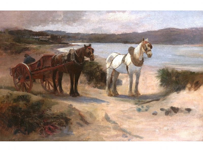 COASTAL SCENE WITH A MAN AND HORSE AND CART NEAR SAND DUNES