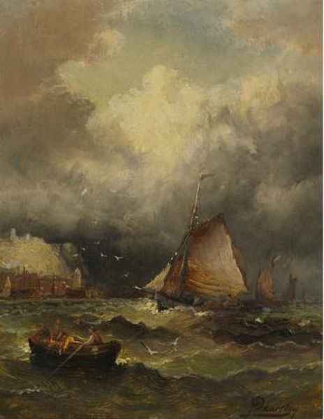 | A coastal scene with men piloting boats on a turbulent sea and a town in the distance | |