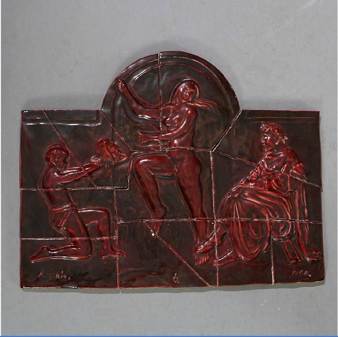Wall relief composed of 13 stoneware tiles decorated with oxblood glaze