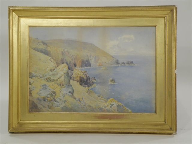 Cornish Cove scene with calm waters and gulls above