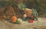 Still life of pineapple, plum, apples, orange and basket on a mossy bank