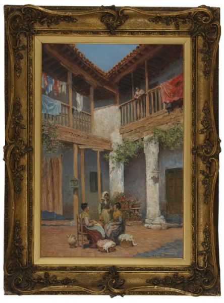 | Sydeuropeisk gårdsinteriör med kvinnor och tvättkorgar | |