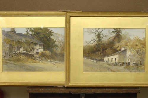 Lakeland Farm with a Drover and Sheep on a Sunlit Lane;