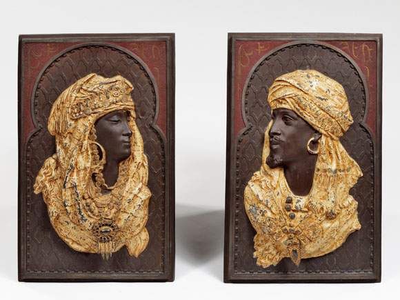 Couple d'orientaux richement parés sur fonds architecturés