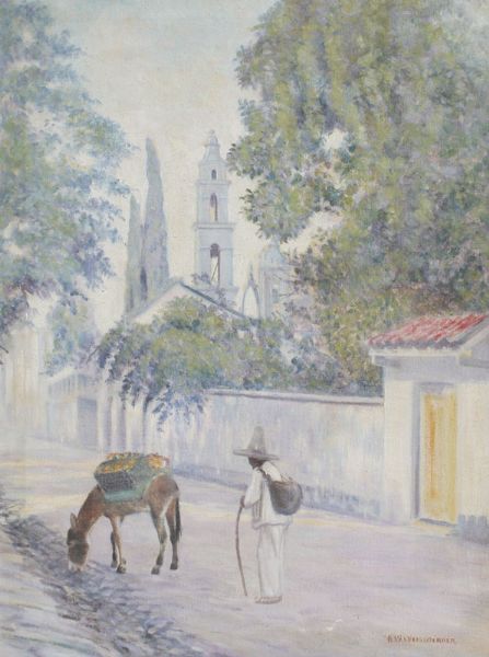 Street Scene With Figure and Burrow With Mission Tower in the Distance