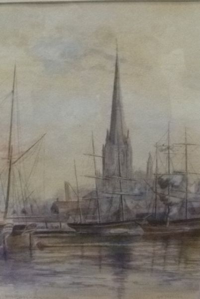 Church, sailing boats at anchor, a tug under steam near a quayside