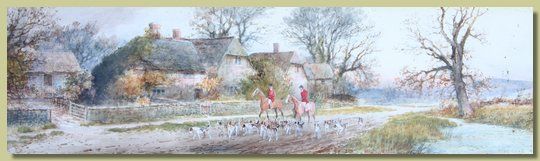 | Huntsman and hounds on a path by a half-timbered house with stream in the foreground | |