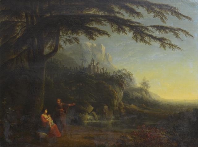 | A wooded river landscape with a Mother and infant Child by a tree, with another figure, bears partial signature 'Devis' (lower l | |