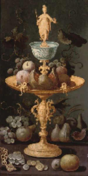 | Grapes, plums and a pomegranate on a gold tazza surmounted by a personification of Painting, with figs, grapes, apples, a gold c | |