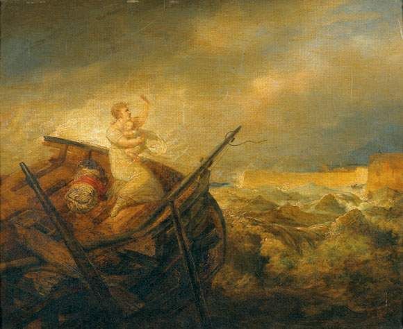 Jeune mère et son enfant dans une barque sur une mer agitée