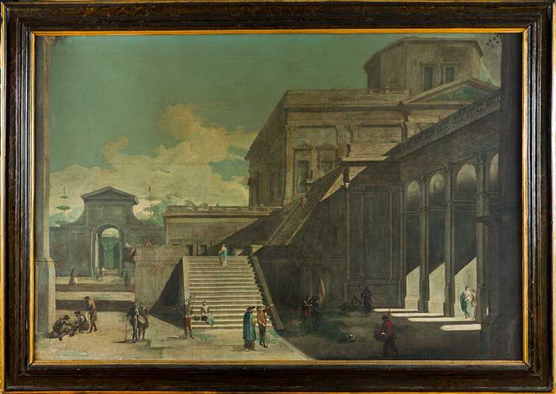 | Capriccio con architetture classiche e scalone monumentale e astanti in conversazione | |