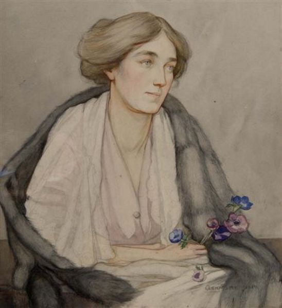 Portrait of a young lady wearing a black fur shawl and holding a sprig of flowers