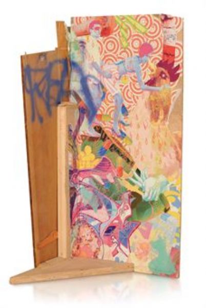 | Painting spray paint and printed paper collage on found wood construction | |