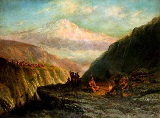 | Native American Indian Chief's (possibly Sitting Bull) meeting above Canyon with other Indian Warriors on horseback, across the | |