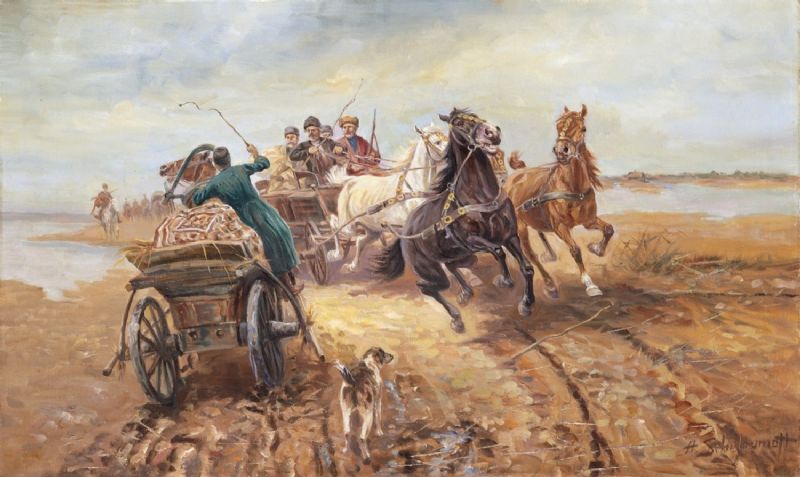 RUSSISCHE LANDSCHAFT MIT PFERDEFUHRWERKEN.