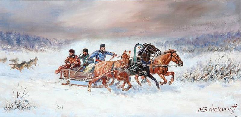 | A Russian winther landscape with a Troika being attacked by wolves | |
