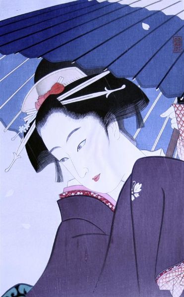 | Print With another of a girl with parasol and a Mitshisuizan of a geisha, unframed woodblock | |