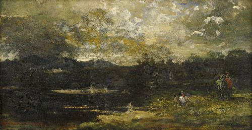 Figuren in einer Landschaft bei aufziehendem Ge...