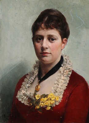 | Portrait of a woman in a red dress and with a gold locket around her neck | |