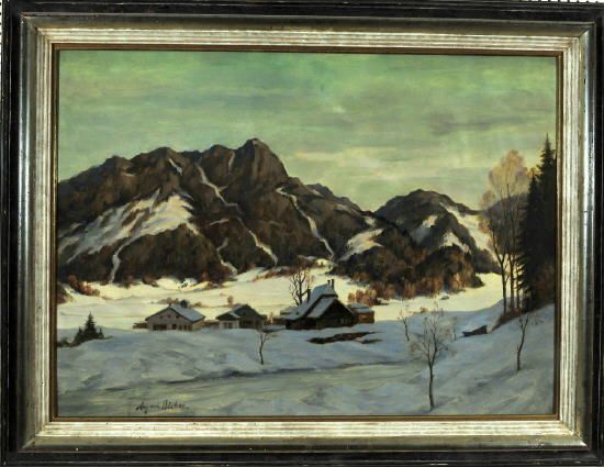 Kleines Dorf im Tal einer winterlicher Berglandschaft