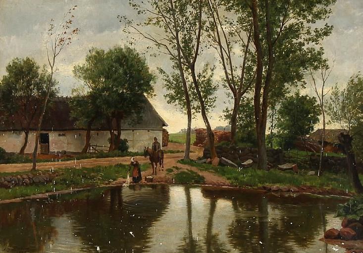 | A washerwoman and a gentleman on horseback at a lake in front of a farm. | |