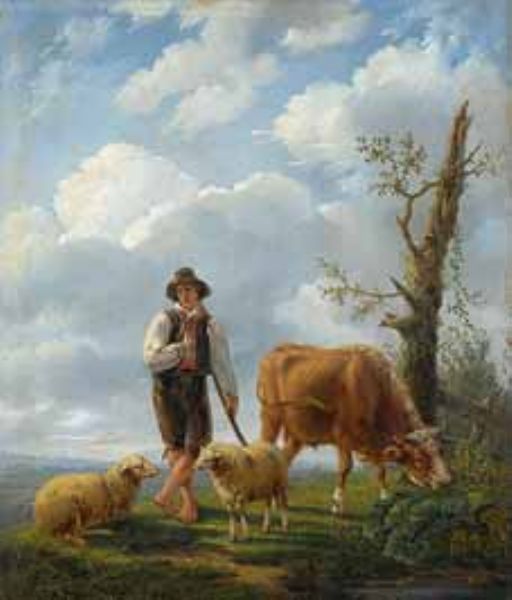 Hirtenjunge mit Kuh und Schafen vor weiter Landschaft