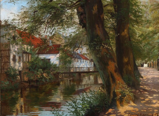 | Sunlight playing on the surface of a stream and between the trees. | |