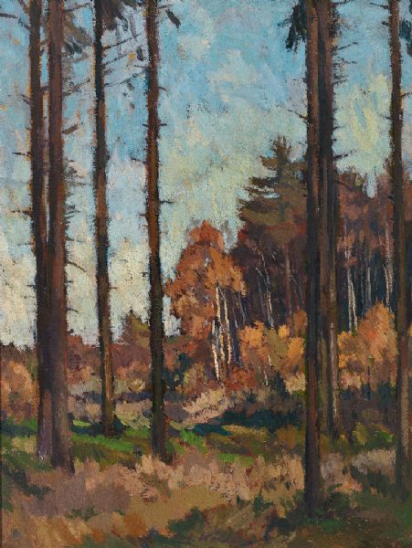 Besonnte Lichtung mit Blick auf herbstlich verfärbten Wald.