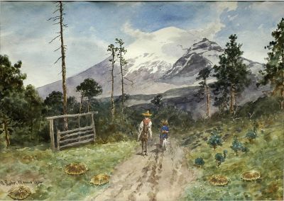 Vista del Popocatépetl y campesinos en vereda