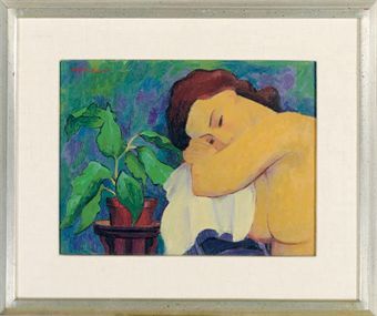 Nude resting by a plant