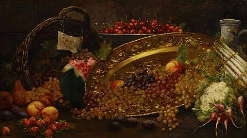 | A still life with grapes in a basket and cherries, peaches and plums on a table | |