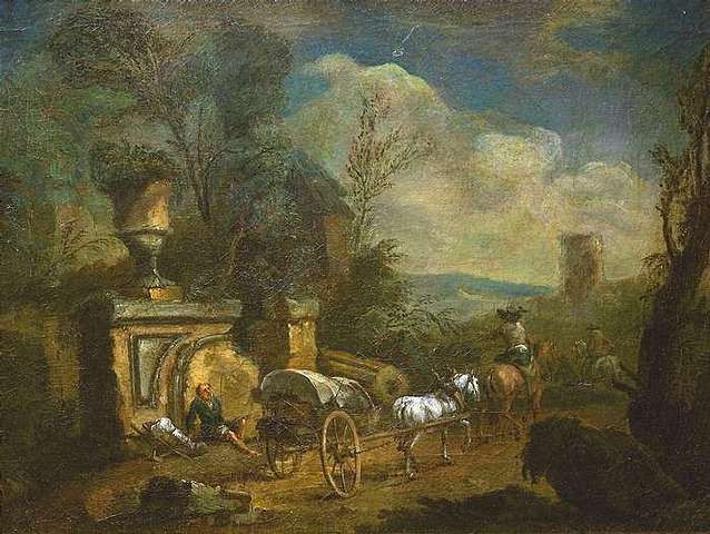 Italienische Landschaft mit Ruinen und Pferdefuhrwerk