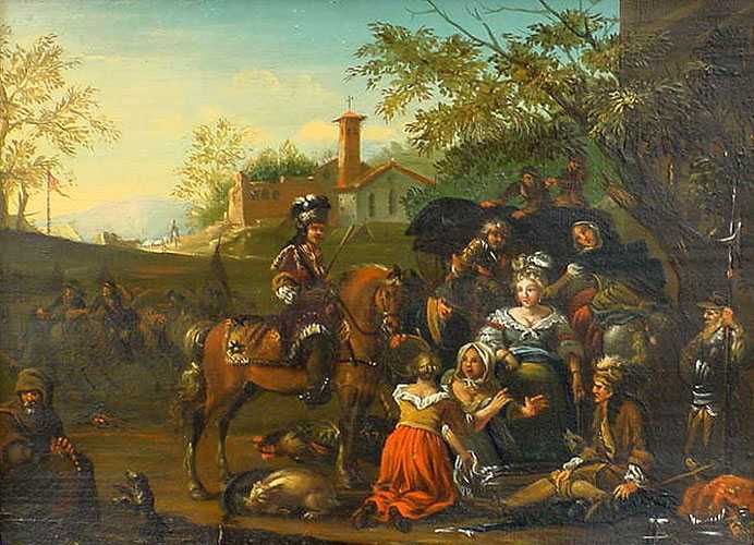 Fahrendes Volk, vor hügeliger Landschaft mit Kapelle lagernd
