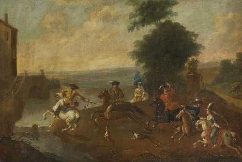 Jagdgesellschaft am Fluss - Rastende Jagdgesellschaft.