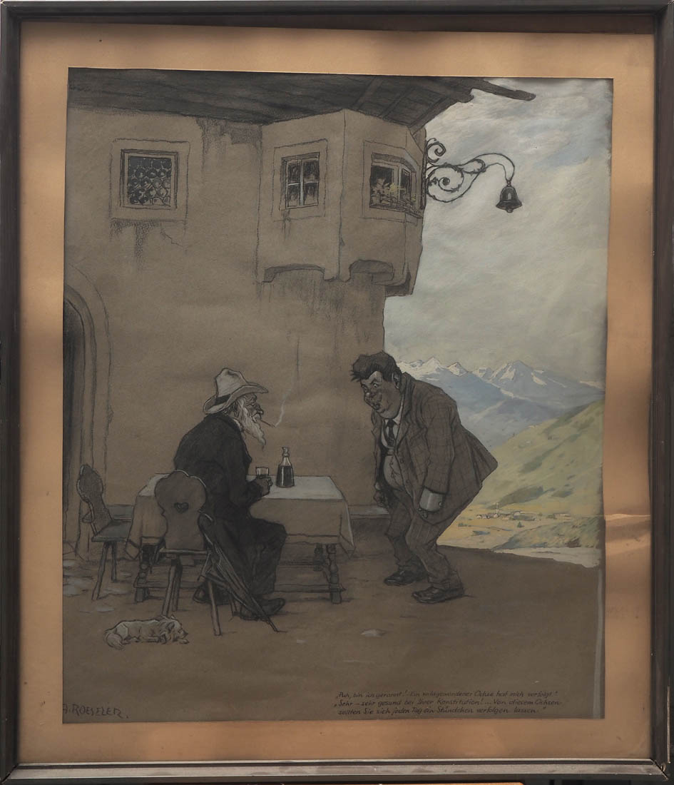 Karikaturistische Szene mit zwei Gestalten vor einem Haus in weiter Alpenlandschaft