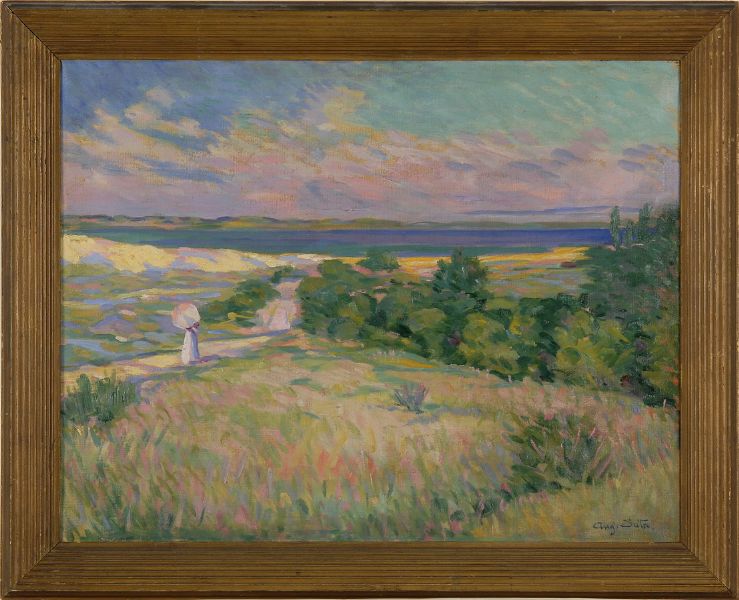 A woman with a parasol strollling the dunes, possibly Sandy Neck, Barnstable.