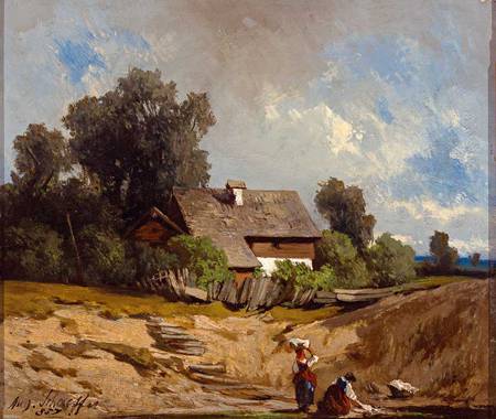 Picturesque farmstead with laundresses by the pond on a summer's day