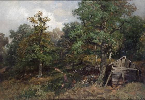 | Sonniger Sommertag im lichten Eichenwald rechts ein zerfallender Holzschuppen | |