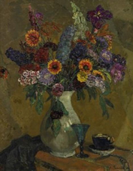 Stilleben mit Sommerblumen in Vase sowie Trinkgefäßen