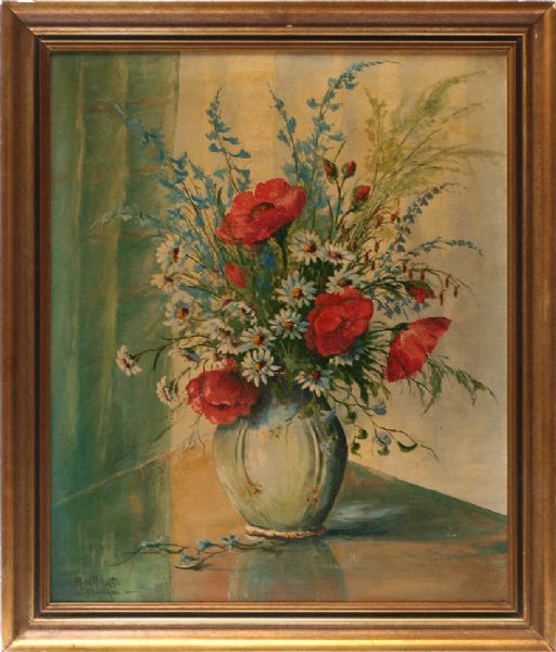 Feldblumenstrauß in zart bemalter Porzellanvase vor zart changierendem Hintergrund