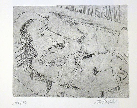 Frau auf Sofa schlafend, zwei sitzende Damen und Familiendarstellung.